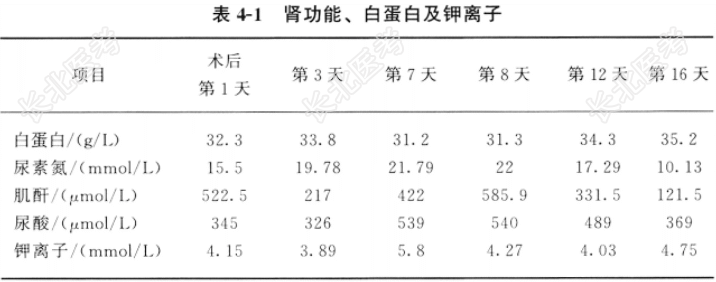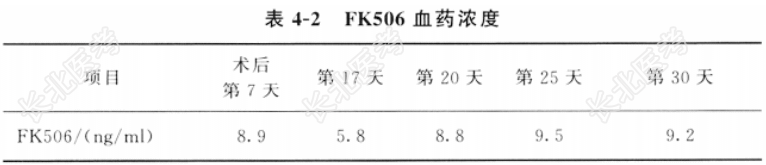 辅助检查 术前:供受体血型相同,均为O型。人类白细胞抗原(HLA)示A位点相容,B、DR位点相配。群体反应性抗体(PRA)示(-)。淋巴细胞毒试验(-)。双肾B超示双肾实质病变(C级)、双肾萎缩,右肾结石、右肾囊肿,腹主动脉、下腔静脉及髂总动静脉未见明显异常。红细胞3.52×10¹²/L,血红蛋白103g/L,白蛋白33.9g/L,肌酐1100.2μmol/L,尿素氮37.7mmol/L,尿酸478.4μmol/L。凝血常规示纤维蛋白原5.89g/L。术后:移植肾彩超示移植肾阻力指数1.0。移植肾穿刺活检示急性排斥反应。空腹血糖6.7~8.7mmol/L,餐后血糖6.3~11.3mmol/L。肾功能、白蛋白及钾离子结果见表4-1。他克莫司(FK506)血药浓度见表4-2。
