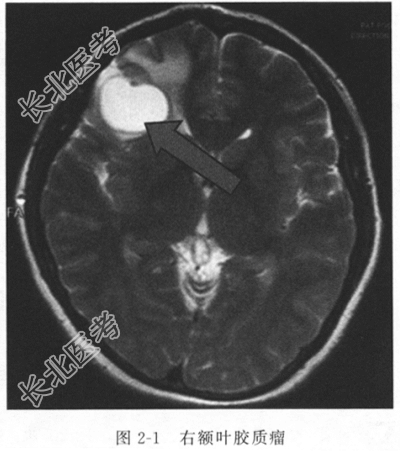 病情 患者,女性,37岁,因头痛半年加重伴抽搐、左下肢乏力4个月入院。患者于5年前在当地行开颅探查右侧额叶病灶切除术,病理结果回报:“(右侧额叶)弥漫性星型细胞瘤WHOⅡ级”,术后恢复良好。3个月前患者无明显诱因出现右侧头痛,当时无呕吐,恶心,无肢体活动障碍,未予处理。后头痛症状加重,并出现抽搐,左下肢乏力,2日前头痛加重,伴呕吐胃内容物一次。门诊以“右侧额叶胶质瘤术后复发”收治入院。患者起病以来,精神、食欲差,入睡困难,否认传染性疾病及家族性疾病史,无药物、食物过敏史。