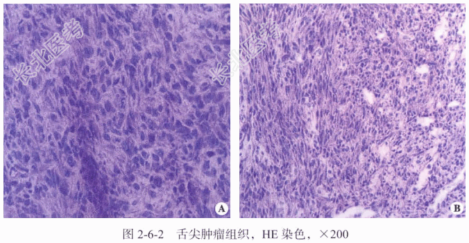 【手术所见】左侧舌腹可见一约1.5cm×2cm葡萄大小的卵圆形肿物突出于黏膜表面,质地韧,活动度差,无渗出,与周围组织边界不清,无压痛,伸舌活动正常,术前考虑恶性肿瘤,拟定将左侧舌尖肿物带周围部分舌体组织做扇形切除,并取肿瘤组织送快速冰冻病理检查。 【病理所见】(左侧舌尖肿物带)黏膜不整组织一块,表面灰黄色,似附舌苔,切面呈灰白色、灰黄色,见一肿物,大小约1.5cm×1.4cm×1cm,质中。另见不整组织一块,大小为2cm×2cm×0.5cm,呈灰红色,质中。高倍镜下可见大量梭形细胞,细胞异型性明显,可见大量核分裂象,未见周围正常组织(图2-6-2)。免疫组化结果A2:S-100(-),SMA(+),Desmin(-),Ki-67(30%+),CD34(-),Myogenin(-),MyoD1(-),Calponin(-),EMA(-),CD68(部分+)。