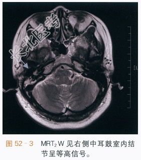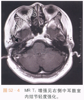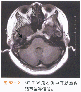 在本院五官科检查,发现右侧鼓膜隆起,右侧听力明显下降,右侧面瘫,实验室检查无特殊发现。分别作CT和MRI增强检查。