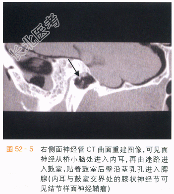 读片分析:面神经鞘瘤多见于面神经位于内耳与鼓室交界处的膝状神经节的面神经管内,它使面神经管扩大,CT扫描可见鼓室内沿后壁的软组织结节影及周围骨质的吸收或破坏,如图52-1所示,在MR图像上,面神经瘤呈等或等高信号,具轻度强化,如图52-2~图52-4所示,面神经鞘瘤主要的临床症状是面神经麻痹或面肌痉挛,可伴听力下降。由于患者临床症状出现较早,因此初次发现的面神经鞘瘤通常不大,需要我们仔细地进行影像学观察,否则容易遗漏。生长得比较大的面神经瘤,可以见到神经鞘瘤特有的囊实性结节,及其相应的影像学表现。