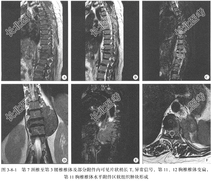 【胸椎MRI检查】仰卧位,以矢状位扫描为主,包括T₁WI、T₂WI及T₂WI脂肪抑制序列,扫描范围自第7颈椎至第1胸椎;辅以冠状位、轴位T₂WI序列。