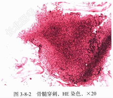【手术所见】患者取俯卧位,C臂下定位第11胸椎椎体后,常规消毒铺巾。在第11胸椎椎体水平背部偏左侧皮肤切一小口,长约0.5cm。用穿刺套管针经皮穿越椎弓根至椎体内。在C臂下行正侧位透视观察,位置良好,拔出套管针芯后,插入环钻取出病变区域组织2块送病检,术毕,切口贴敷料。肉眼所见:骨髓条索状物3条,长0.2~0.4cm,直径0.2cm,呈灰白色,质中。 【病理所见】胸椎病变,破碎骨组织2块,于骨组织周边见少许小至中等大小的细胞,骨髓常规:增生活跃,骨髓瘤细胞占52%,双核、三核及多核瘤细胞易见,考虑为多发性骨髓瘤。骨髓活检:HE及PAS染色示骨髓增生较活跃(60%~70%),异型浆细胞明显增生(约80%),肿瘤细胞呈浆细胞样分化,细胞单一,胞质丰富,排列密集,弥漫分布,可见核仁(图3-8-2);偏成熟阶段粒红系细胞散在分布。网状纤维染色(MF0级)。免疫组化标记结果显示浆细胞分化,结合形态学与免疫组化结果诊断为浆细胞性骨髓瘤,κ链限制性表达。免疫组化结果:MPO粒系(+)、CD235a红系(-)、CD61巨核系(+)、CD38(-)、CD138(+)、κ(+)、λ(-)、CD117(-)、CD34(-)、CD3(-)、CD20(散在+)。
