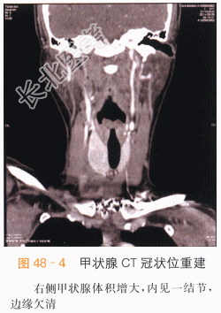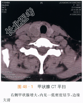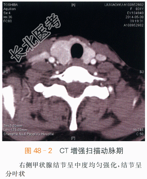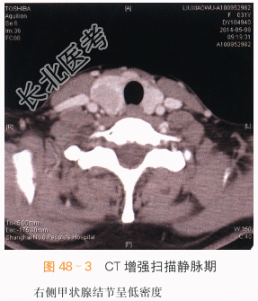 读片分析:甲状腺癌是头颈部常见的恶性肿瘤,女性较多见。由于甲状腺位于颈部浅表,因此超声检查有明显优越性,超声表现:①癌瘤边界不规整,呈锯齿状或蟹足状;②内部呈不均质低回声;③癌瘤内可出现点状或簇状钙化点;④囊性变时常液化不全;⑤CDFI有新生血管及动静脉瘘现象;⑥周围小血管内可形成癌栓;⑦向颈部淋巴结转移而肿大;⑧侵犯喉返神经,引起声带麻痹。 本案例CT扫描见右侧甲状腺增大,结节与正常甲状腺分界不清,呈低密度,见沙砾样钙化(见图48-1),增强后呈低度强化,甲状腺包膜不完整,(见图48-2~图48-4),结合超声检查,考虑甲状腺癌。 本案例手术病理结果为右侧甲状腺乳头状癌、大小3cm×2cm。 肿瘤组织免疫标记结果:TPO(部分+)、G-3(+)、CK19(+)、HBME-1(+)、P53(局灶弱+)、TG(+)、TTF-1(+)、Ki67(1%+)。