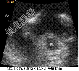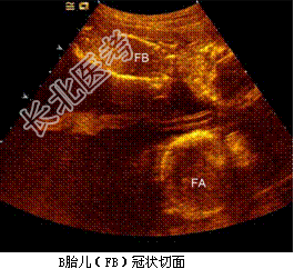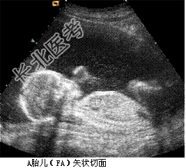 - [材料题] 孕妇,30岁,孕2产0孕22周。超声(孕12周):宫内妊娠,单绒毛膜囊双羊膜囊双活胎,A胎儿NT0.32cm,B胎儿NT0.12cm。孕22周复查超声如下图。