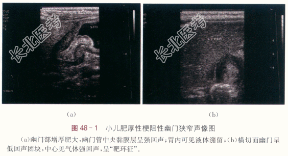 患儿上腹部稍膨隆,见胃形及蠕动波,腹软,于中上腹可扪及肿块,呈橄榄形,大小约3cm×2cm,质地不硬。肝肋下可及,剑突下2cm,脾肋下2cm可及。肠鸣音正常,未闻及血管杂音。
