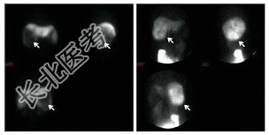 - [材料题] 男性,48岁,上腹部不适,AFP阴性,行⁹⁹Tcᵐ-Phy及⁶⁷Ga-枸橼酸钠显像如图: