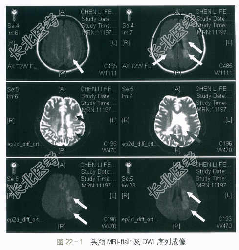 (2)影像学检查:①视觉诱发电位:双眼视觉诱发电位P100波未引出。②视野检查:双眼颞部视野缺损。③头颅MRI:双侧脑室旁可见多发斑片状长T1长T2信号灶,flair呈高信号,DWI呈高信号,病灶与侧脑室方向垂直。增强后可见点片状强化。脑室系统未见异常,中线结构居中。考虑:两侧脑室旁多发MS,以枕角旁为著,如图22-1所示。④颈椎MRI:颈髓未见异常信号。⑤胸椎MRI:胸椎MRI平扫胸髓未见明显异常。