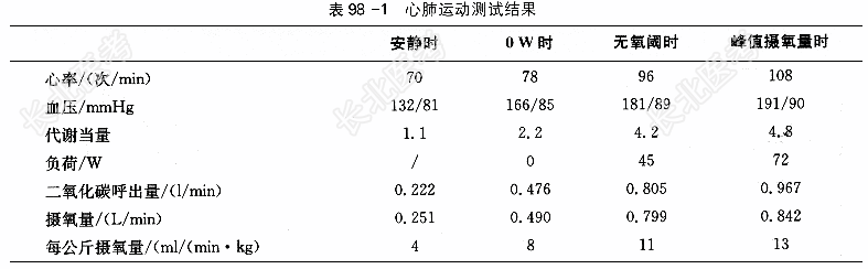 (4)心肺运动测试(入院第5日): 测试方案:RAMP方案(斜率20W/min)。 测试经过:运动总时间7min,递增负荷踏车运动第4分钟患者自感劳累分级表大于12级,因处于术后第3日,患者存在思想顾虑放弃继续踏车运动,故停止递增负荷,目标心率131次/min,运动最大心率113次/min,未达到目标心率,运动负荷45W时测得无氧阈摄氧量(摄氧量/kg:11ml/(min·kg),运动负荷72W时测得峰值摄氧量(摄氧量/kg:13ml/(min·kg)。因患者放弃继续踏车,故该指标仅作参考),与运动前相比运动中、运动后未见ST段异常变化,如表98-1、图98-2所示。