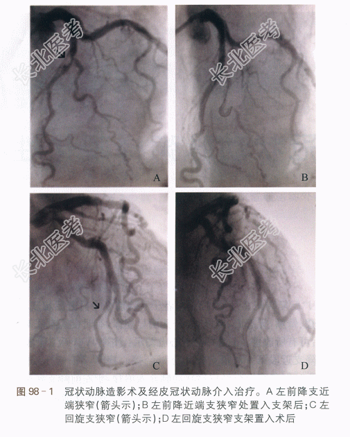 (3)冠脉造影(入院第2日):左主干(-),左前降支近中段支架通畅无再狭窄,远段50%局限狭窄;回旋支中段90%狭窄;右冠状动脉中段40%狭窄,如图98-1所示。
