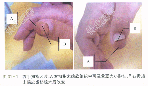 右手拇指远端指节部分缺如,拇指指甲甲床部分保留,右拇指末端皮瓣移植术后改变,右侧掌指关节可见瘢痕,右拇指末端软组织中可及黄豆大小肿块,拇指末端皮肤极度敏感,触之即有放射痛,重度压痛,轻度按压时有退缩反应,如图31-1所示。右拇指远端及近端关节活动度好,肌力正常。疼痛视觉模拟评分法(visual analogue scale,VAS)评定7分。