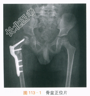 X线片提示:右股骨头骨骺形态欠光整,干骺端“杯口状”凹陷伴不规则高密度影,右侧股骨截骨术后,内固定在位,截骨线可见,如图113-1所示。