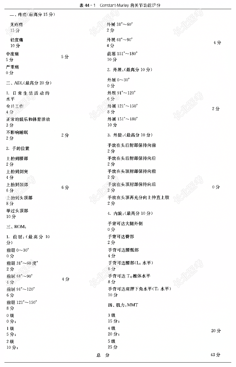 T36.8℃,BP125/68mmHg,P65次/min,R12次/min。神志清楚,精神尚可,查体合作,脊柱生理曲度存在,未及明显侧凸及后凸畸形,颈腰椎棘突、棘间及棘突旁压痛、叩击痛(-),活动无明显受限,双侧肢体针刺觉对称存在,四肢肌力4级,肌张力正常,双侧Hoffmann征(-)、Babinski征(-)、Chaddock征(-)、Oppenheim征(-)。右肩关节局部无肿胀,肩峰下及结节间沟处压痛(++),右肘、腕及指关节活动正常,右上肢皮肤感觉正常,右桡动脉搏动正常。徒手肌力测试(manual muscle test,MMT):右肩前屈肌力5级,外展肌力4级,后伸肌力4级,右肩内旋肌力5级,外旋肌力5级;主动关节活动度(active range of motion,AROM):前屈80°,外展70°,后伸0°,内旋5°,外旋5°;被动关节活动度(positive range of motion,PROM):右肩前屈90°,外展90°,后伸5°,内旋15°,外旋15°;Constant-Murley肩关节功能评分:43分,如表44-1所示。日常生活活动能力(active of daily living,ADL)评定:改良Barthel指数80分。视觉模拟评分(Visual Analogue Score,VAS)8分。