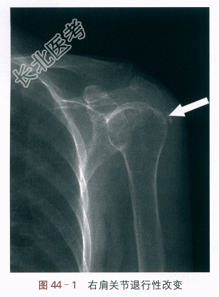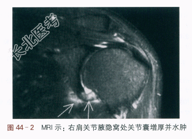 4.辅助检查 X线提示:右肩关节退行性改变,如图44-1所示。MRI提示:右肩关节腋隐窝处关节囊增厚并水肿,如图44-2所示。