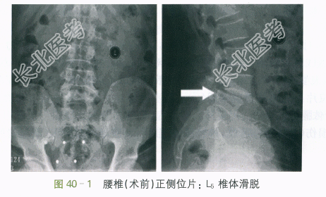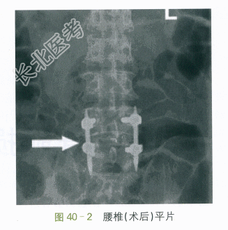 3.辅助检查:腰椎正侧位片(术前):L₅椎体滑脱,如图40-1所示。腰椎平片(术后):L₅椎体滑脱术后,如图40-2所示。