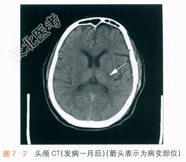 头颅CT(1个月后复查):左侧丘脑-基底节脑出血,较前片吸收减小,如图7-2所示。