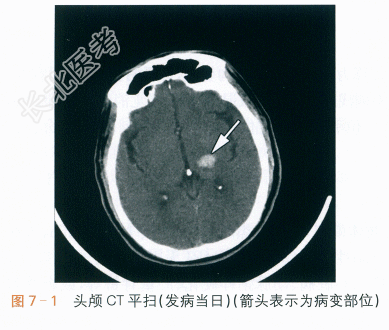 头颅CT(发病当日):左侧丘脑一基底节脑出血,如图7-1所示。