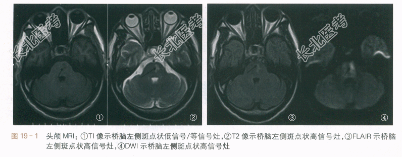 (2)影像学检查:头颅MRI示桥脑左侧新鲜腔隙性梗死,如图19-1所示。颈、椎动脉及下肢血管超声无异常。