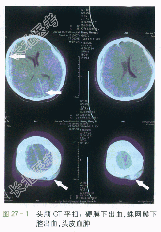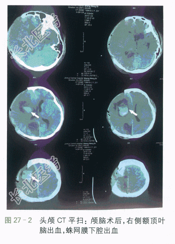 (2)影像学检查。头颅CT(术前):硬膜下出血,蛛网膜下腔出血,头皮血肿,如图27-1所示。头颅CT(术后):右侧额顶叶脑出血,右侧枕叶、双侧额叶、左侧颞叶及丘脑梗死灶考虑;蛛网膜下腔出血,如图27-2所示。