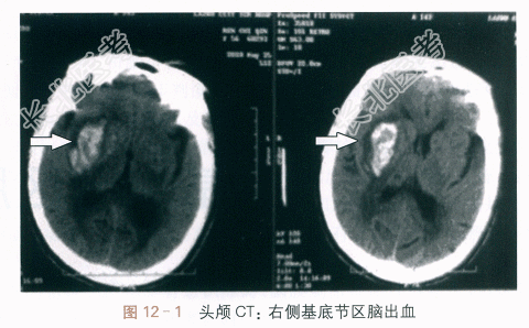 (2)影像学检查:头颅CT示右侧基底节区脑出血,如图12-1所示。颈、椎动脉及下肢血管超声无异常。