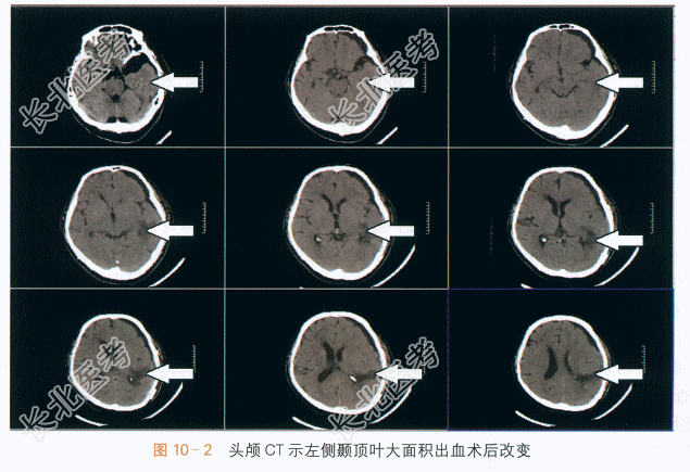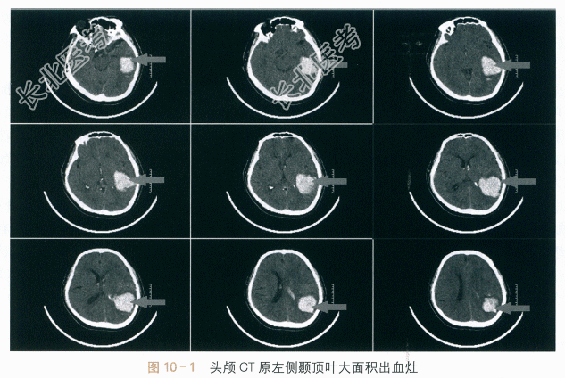 (1)头颅CT(术前):左侧颞顶叶脑出血,右侧基底节区腔隙灶,如图10-1所示。