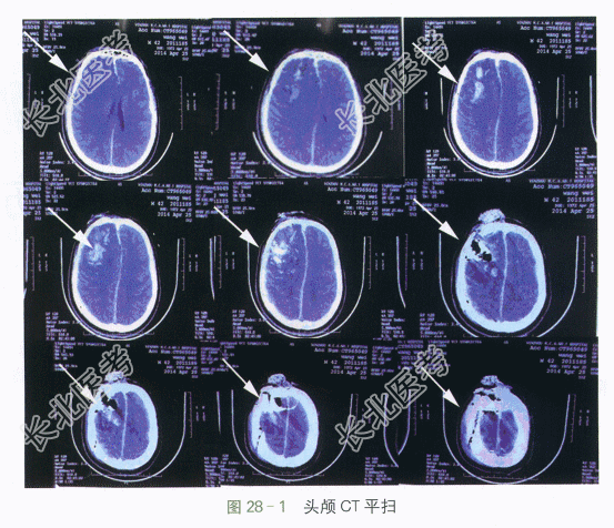 (2)影像学检查:外院头颅CT示右侧额叶脑挫伤;右侧额骨骨折,如图28-1所示。