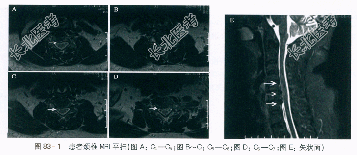 (1)颈椎MRI平扫:颈椎曲度变直,多节椎间盘退变。C₄-C₅椎间盘膨隆,C₅-C₆、C₆-C₇椎间盘突出,硬膜囊及脊髓轻度受压。颈椎退变。如图83-1所示。