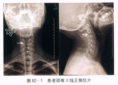 (1)颈椎X线片示:生理曲度存在,颈椎C₂/C₃序列欠齐,C₃/C₄椎间小关节异常,椎间隙无狭窄。如图82-1所示。