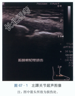 长屈肌4级,趾肌4肌。Barthel指数=进食10+洗澡0+修饰5+穿衣5+控制大便10+控制小便10+如厕5+转移10+行走15+上下楼梯10=80分。视觉模拟(visual analogue scale,VAS)评分5分。 4.实验室和影像学检查 血常规:WBC7.5×10⁹/L,GR52.6%,RBC5.02×10¹²/L,Hb132g/L,PLt205×10⁹/L。凝血功能:凝血酶原时间国际正常化比值2.0,D-二聚体0.46mg/L。血钾3.9mmol/L,血钠140mmol/L,血氯102mmol/L,血钙2.1mmol/L。左踝关节X线片提示:左踝关节未见骨折,踝穴不宽。左踝关节超声示:距腓前韧带增厚回声减低,距骨附着点处可见小的撕脱骨折。如图67-1所示左踝关节MRI提示:距腓前韧带撕裂,距骨附着点损伤,距骨骨髓水肿,左踝关节少量积液。