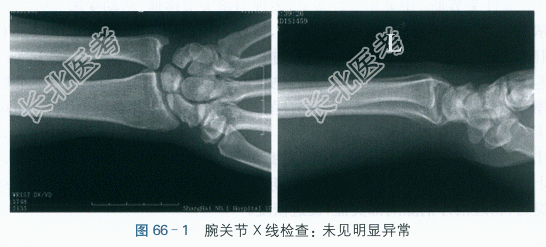 腕关节X线检查,未见明显异常,如图66-1所示。