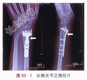 X线片提示:右侧桡骨远端骨折内固定术后,如图53-1所示。