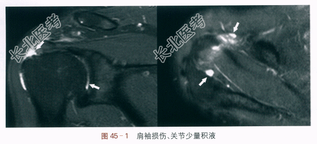 左肩关节MRI:肩袖损伤,关节少量积液,如图45-1所示。