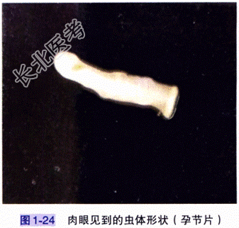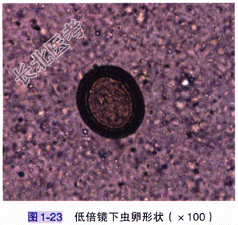 - [材料题] 患者,女,24岁,体重52kg,贵州省从江县人。主因上腹部疼痛、肛门瘙痒不适就诊于我院消化内科。体格检查 T36.6℃,R20次/分,P75次/分,BP108/68mmHg。发育正常,神志清楚,查体合作,颜面部无毛细血管扩张,全身皮肤黏膜无黄染,未见出血点及瘀斑,全身浅表淋巴结未触及肿大;巩膜无黄染,睑结膜无苍白,咽不红,双侧扁桃体无肿大;颈软,气管居中,甲状腺无肿大;腹部平坦,无胃肠型及蠕动波,右上腹轻压痛,肝、脾肋下未触及,移动性浊音阴性,肠鸣音无亢进;双下肢无水肿,肛门及外生殖器未查。实验室检查:粪便中找到椭圆形、带卵壳、内可见放射状条纹的虫卵,低倍镜下形状见图1-23,并且在粪便中找到了如图1-24所示的结构。