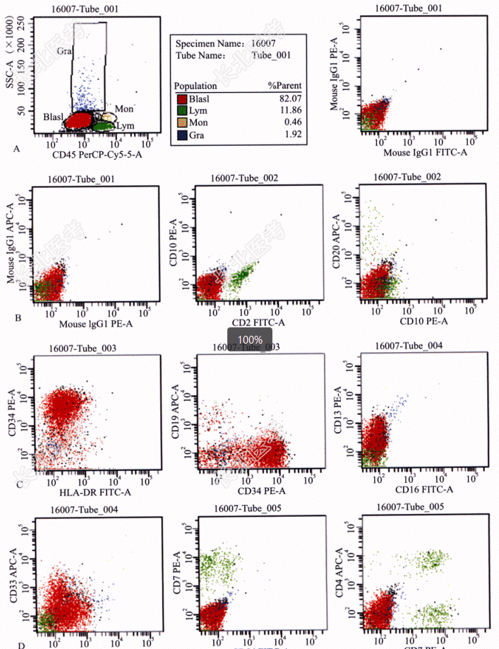 - [材料题] 患者,女,20岁。因“发热、腰部疼痛,伴牙龈、鼻腔出血、全身散在出血点1周”就诊。门诊血常规检测结果:WBC66.95×10⁹/L,中性粒细胞百分比2.1%,淋巴细胞百分比92.3%,单核细胞百分比5.6%,RBC1.72×10¹²/L,Hb76g/L,PLT4×10⁹/L;外周血涂片见大量原始和幼稚细胞,遂以“急性白血病”收住我院血液内科。体格检查 T39.5℃,P109次/分,R26次/分,BP101/59mmHg。神志清楚,发育正常,急性病面容,全身皮肤中度苍白、无黄染,双下肢皮肤见散在出血点和瘀斑,全身浅表淋巴结未触及;双侧瞳孔等大正圆,直径3mm,对光反射存在,右眼底视网膜及黄斑区可见散在出血点;双侧鼻腔未见活动出血,牙龈肿胀,大部分牙龈有渗血;右侧扁桃体Ⅱ度肿大,表面有脓点、软;甲状腺不大,气管居中,颈静脉无怒张;胸骨有明显压痛,胸廓无畸形,双肺呼吸音清,未闻及干、湿啰音,心界不大、心律齐,心率109次/分、心脏各瓣膜未闻及杂音;腹平软,肝、脾肋下侧位可触及,其余部位未扪及肿块;四肢关节未见红肿,生理反射存在,未引出病理神经反射。辅助检查:(1)常规检查:①血常规:WBC66.95×10⁹/L,中性粒细胞百分比2.1%,淋巴细胞百分比92.3%,单核细胞百分比5.6%,RBC1.72×10¹²/L,Hb76g/L,PLT4×10⁹/L;外周血涂片见大量原始和幼稚细胞。②凝血功能:纤维蛋白原4.40g/L(↑)。③尿便常规:粪便未见异常;尿常规RBC(+++),余未见异常。④血液生化:球蛋白31.6g/L(↑),α-羟丁酸脱氢酶212U/L(↑),腺苷脱氨酶64.2U/L(↑),同型半胱氨酸33.14μmol/L(↑),β₂-微球蛋白2.35mg/L(↑);其他检验结果:ESR114mm/h,降钙素原0.01μg/L,hs-CRP74.5mg/L(↑)。(2)细胞形态学检查:①血象结果:原始细胞占85%,建议做骨髓细胞形态学检查(图2-24)。②骨髓象结果:分类原始细胞占92%,该类细胞胞体偏小,胞质量少,染浅蓝色,核圆形,染色质细致疏松,可见2~5个小而清晰的核仁。结合形态学考虑急性白血病,建议做流式细胞学检查以明确分型(图2-25)。③细胞化学染色检查:骨髓过氧化物酶染色,白血病细胞阳性率占2%,考虑急性髓细胞白血病(M1)(图2-26)。(3)骨髓活检:①镜下描述:骨髓增生极度活跃,粒红比不宜评估,原始细胞呈大片状分布,胞体不大,胞核多呈圆形或类圆形,染色质浅染,胞质量偏少;可见少量中、晚幼稚粒细胞,红系少见;巨核细胞未见,淋巴细胞少见,未见纤维增生。②免疫组化:CD34大片(+),CD117大片(+),CD33大片(-),MPO(-),CD3(-),CD10(-),PAX(-)。③骨髓活检分析结果:结合镜下形态和免疫组化,符合急性白血病,请结合骨髓涂片形态、流式细胞学和分子检查明确分型。④流式细胞学分析:在CD45/SSC点图上,可见异常细胞群Blast,占有核细胞的82.07%。主要表达CD34、cMPO,部分表达HLA-DR、CD13、CD64、CD117,弱表达CD15、CD11b(图2-27)。提示急性髓细胞白血病未成熟型(AML-M1),请结合临床表现、细胞形态学和细胞遗传学结果进一步确诊。(4)分子生物学:融合基因BCR-ABL阴性。样本存在肿瘤克隆基因,多个染色体异常。Y、1、2、3、4、5、7、8、9、11、13、17号染色体检测到异常拷贝数。(5)临床诊断:急性髓细胞白血病(M1)。