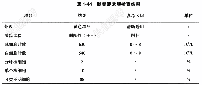 - [材料题] 患者,女,49岁。1年前明确诊断急性髓系白血病(M5a型)伴MLL/AF9突变高危组CR1,并于我院行化疗治疗。3个月前无明显诱因出现双侧颈肩部、双侧上肢疼痛,转颈时左侧上肢牵扯样疼痛,伴双侧上肢麻木感,无发热、咳嗽、咳痰,无心悸、气促及呼吸困难,无腹痛、腹胀等不适,当时患者因在血液内科行化学治疗(简称化疗),会诊后给予保守治疗;后因颈肩部疼痛于疼痛科住院治疗,行局部麻醉后数字减影血管造影(DSA)引导下经皮穿刺行颈椎间盘射频热凝、臭氧消融术,术后疼痛明显缓解后出院。10⁺d前感觉双侧颈肩部疼痛、麻木加重,左侧较右侧明显,并有双手远端指节麻木、持物不牢及灵活性降低。为求进一步诊治入住我院。体格检查 T36.8℃,P59次/分,R19次/分,BP131/63mmHg。全身皮肤黏膜、巩膜无黄染,浅表淋巴结未扪及明显肿大;头颅、五官无畸形,右侧面部肿胀,无明显波动感,局部压痛,张口受限,右下第6颗牙龈稍红肿,无破溃及溢脓等;气管居中,甲状腺未扪及肿大;胸廓双侧对称无畸形,胸廓挤压征阴性,双肺呼吸音稍低,未闻及明显的干、湿啰音;心界不大,律齐,各瓣膜听诊区未闻及明显的病理性杂音;腹平软,无胃肠型及蠕动波,无压痛、反跳痛及肌紧张,肝、脾未触及,移动性浊音阴性,肠鸣音正常。辅助检查:(1)常规检查:见表1-42至表1-44。(2)细胞形态学检查:脑脊液常规检查发现分类不明细胞,离心推片后瑞氏-吉姆萨复合染色(图1-41)如下:该类细胞胞体较正常成熟淋巴细胞偏大,呈圆形或类圆形;胞质很少,核质比高,质呈蓝色;核为圆形或类圆形,核染色质疏松、细致。(3)病理诊断:①左侧颈部肿块,穿刺病理活检提示:恶性肿瘤;②免疫组化提示:CD163(+),CD68(PGM1)(+),MPO(小灶+),CD138(-),CD3(-),CK(-),CK20(-),TdT(-),Ki-67(90%+),CD10(-),CD117(-),CD34(-),CD38(-);Kappa及Lambda无优势表达。结合组织学形态及病史,诊断为急性白血病髓外肉瘤。