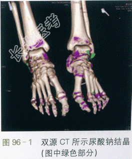 BUN4.2mmol/L,Cr66μmol/L,BUA570μmol/L,HLA-B5 801阴性,血糖5.3mmol/L。血脂:TC4.12mmol/L,TG8.27mmol/L,hsCRP6.8mg/L;ESR40mm/h。血常规:RBC4.51×1012/L,Hb134g/L,PLT206×109/L,WBC6.22×109/L。尿常规:pH5.00;24h尿液总量1.70L;24h尿蛋白定量0.05g;24h尿尿酸4403μmol(低嘌呤饮食状态下)。双源CT:左膝关节细小尿酸结晶沉积;双足及右踝关节肌腱区散发尿酸结晶沉积(见图96-1)。B超:左肾结石。