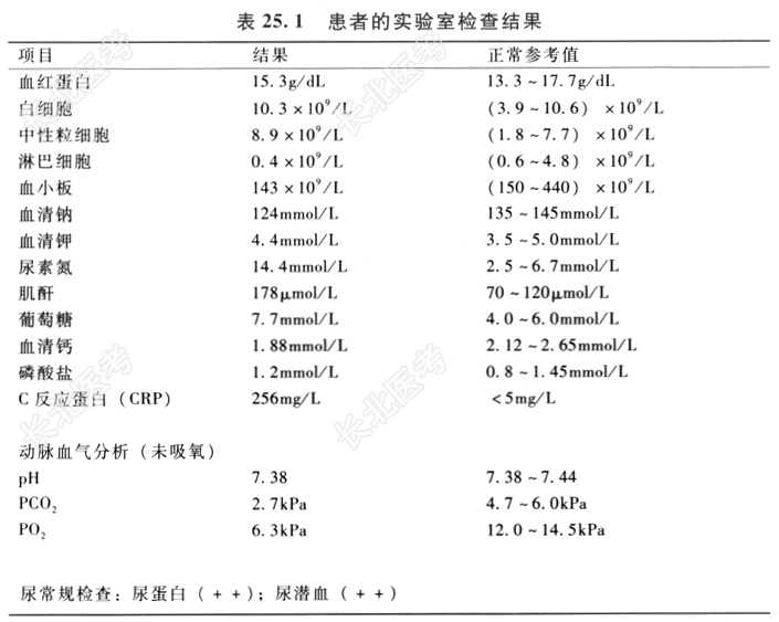 患者男性,62岁,因气促急诊就诊。4d前患者感觉不适,诉有肌肉疼痛、头痛。3d前开始出现寒战,其妻子为其测体温为39℃。自行按“流感”服用对乙酰氨基酚并卧床休息。但上述症状恶化,2d后诉有干咳和明显的气促。此外,患者开始出现精神错乱及腹泻。无特殊既往病史。无吸烟嗜好,饮酒量20个酒精单位/周。入院10d前,患者刚从西班牙和葡萄牙海边旅游归来。