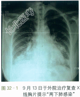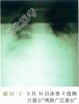 该患者于2009年11月9日起病,咳嗽,发热,体温38.5℃,有畏寒,无寒战。查血WBC7.3×109/L,N89.4%,X线胸片提示未见异常,予头孢呋辛治疗无好转。13日于外院治疗复查X线胸片提示"两下肺感染"(见图32-1),并改用青霉素治疗。14日收住另一医院住院治疗,期间病情加重,出现气急、胸闷,咳铁锈色泡沫痰,每日30口。16日晨出现面色发绀,未吸氧时氧饱和度低至50%,复查床旁X线胸片提示"两肺广泛渗出"(见图32-2)。转入我院,在发热门诊查甲流(+),H1N1(可疑)。患者仍有发热,气急较前加重,予奥司他韦75mg po bid,以及无创呼吸机治疗并转入呼吸科ICU。