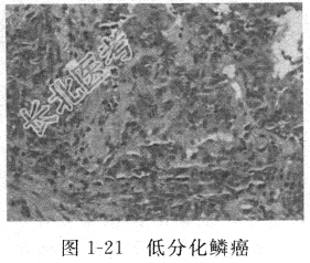 患者男性,因咳嗽、胸痛伴消瘦入院,有吸烟史多年。入院后胸部增强CT(图1-19、图1-20)示右肺上叶见一大小约4.1cm×2.9cm×2.3cm团块影,边界不清,灶周见毛刺及斑状密影,对比增强扫描后呈不均匀强化,CT值28~55Hu,纵隔及双肺门多发肿大淋巴结,部分融合成团,内见坏死及钙化。彩色B超示左右锁骨上各探及一个淋巴结,分别为0.9cm×1.0cm及0.9cm×0.8cm,头颅MRI、腹部超声及全身骨扫描未见明显异常。肿瘤标志物癌胚抗原(CEA)112.2μg/L、鳞状上皮细胞癌抗原(SCC)4.51μg/L、CY-FRA2-1 41.86μg/L明显升高。行肺内肿物穿刺病理结果为:低分化鳞癌(图1-21)。