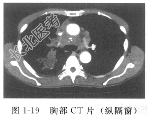 - [材料题] 患者男性,68岁,因“反复咳嗽、胸痛半年,加重伴消瘦、乏力1个月”入院。入院前于外院门诊行胸部X线片示右上肺一类圆形阴影,大小约4.0cm×3.0cm,周围毛刺状。查体:消瘦,神倦,左右锁骨上均可触及1~2个约0.9cm×0.8cm肿大淋巴结,质地硬,活动性差,表面欠光滑,边界欠清;无明显压痛。患者吸烟40年,每天20~30支。入院初步诊断:左上肺占位性病变(性质待定)。