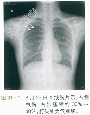 - [材料题] 患者,女性,17岁,因“右季肋区疼痛3天”入院。3天前(2014年8月23日)患者突觉咳嗽时右下肋明显疼痛,伴轻度胸闷,无发热、咯血及盗汗,我院查X线胸片示:两肺纹理增多,右胸可见气胸带(肺压缩约20%),未见明显肺部渗出等活动性病变,心影大小在正常范围,纵隔影无增宽,两膈面光滑,两肋膈角欠锐利。诊断为右侧气胸。患者稍有干咳,无明显气促,故行保守治疗。2014年8月25日至我院复查,诉活动时气促,X线胸片示:右侧上肺野见局部无纹理带状影,右肺压缩约40%(见图31-1),为进一步治疗收住入院。自发病以来,患者一般情况好,二便如常,体重无明显下降。既往史无特殊;否认药物过敏史。体格检查:T36.8℃,BP120mmHg/62mmHg,R16次/min,P68次/min,SpO₂99%(不吸氧)。呼吸平稳,口唇无发绀,气管居中。颈部、前胸触诊无“握雪感”。右肺呼吸音低,两肺未及啰音。心律齐,未闻及杂音。下肢无水肿。实验室和影像学检查:血常规、肝肾功能、凝血功能(包括D-二聚体)检查均正常。X线胸片检查示:右侧气胸。胸部CT检查除气胸表现外,未见明显肺大疱。