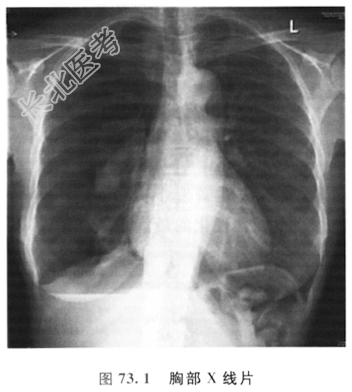 脉搏:88/min;呼吸:20/min;血压:128/78mmHg。精神可,无发绀。心音正常。呼吸系统查体:气管和心尖搏动无移位;呼吸动度和叩诊大致正常;右侧触觉语颤减弱,呼吸音降低;右下肋膈角可闻及胸膜摩擦音;听诊未闻及其他附加音。