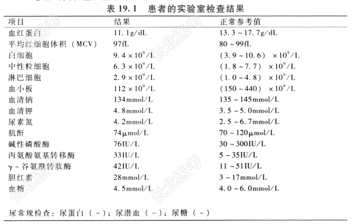 患者18岁时患传染性单核细胞增多症,4年前有肝炎病史。吸烟15~20支/天,偶尔吸食大麻,否认静脉药物滥用史,饮酒量14个酒精单位/周。除预防疟疾的药物外未服用其他药物。否认同性性生活史,每年有多次异性性生活史,均有采取保护措施。患者6周前工作于尼日利亚一家石油公司,期间未生病,3周前从尼日利亚返回,已按惯例完成疟疾预防。
