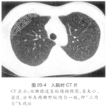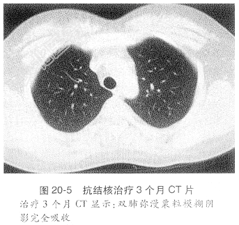 患者入院时查体:体温38.9℃,脉搏110次/min,呼吸23次/min。神志清楚,皮肤、巩膜无黄染,双侧颈部未扪及肿大淋巴结。双肺呼吸运动对称,双肺呼吸音稍粗,未闻及干湿啰音。心率110次/min,律齐,未闻及杂音。腹软,无压痛及反跳痛,肝脾肋下未及,神经系统体征阴性。辅助检查示:血气分析示pH7.45,二氧化碳分压27.9mmHg,氧分压159mmHg,氧饱和度99.3%。血沉35mm/h,C-反应蛋白10mg/L,血结核抗体阴性,血T-SPOT检查A抗原30,B抗原50。血白细胞总数正常。痰浓缩找抗酸杆菌3次阴性,痰荧光双标记定量结核分枝杆菌阴性。血生化示肝肾功能正常。胸CT示双肺弥漫粟粒模糊阴影(图20-4)。腰穿查脑脊液示糖2.9mmol/L、氯化物118mmol/L、ADA1.4U/L、蛋白945mg/L、白细胞5.0×10⁹/L;头颅MR示颅内多发结节空洞样病灶。根据患者以上检查结果诊断为急性血行播散性肺结核;结核性脑膜炎伴颅内多发结核瘤,给予加强抗结核治疗及激素治疗,同时降颅压等对症治疗。待临床症状明显改善后,激素逐渐减量至停用,治疗3个月后复查胸CT示双肺弥漫性病灶基本吸收(图20-5)。复查腰穿查脑脊液化验结果示糖4.0mmol/L、氯化物122mmol/L、ADA1.0U/L、蛋白294mg/L、白细胞5.0较前明显好转。