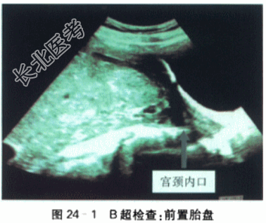 - [材料题] 产妇,25岁,因孕30⁺⁴周,无痛性阴道出血1h余来院就诊。LMP2021-12-29,EDC2022-10-6,停经30天,查尿β-HCG(+),孕2月出现轻微早孕反应(恶心、呕吐),孕5月出现胎动,胎动好,定期于外院做产前检查,2022-6-5外院超声提示单胎,胎盘后壁,胎盘下缘似部分覆盖宫颈内口。今孕妇30⁺⁴周,夜间睡眠中,突发无痛性阴道出血,量约10ml,色鲜红,内裤血迹晕染呈淡红色。遂至外院急诊,病程记录当时查体“未及宫缩,血水打湿内裤,色鲜红,阴道窥积检查:胎膜似已破,宫口未开,阴道内有中等量鲜红色血水,膝反射存在”,遂予安宝100mg,20滴/min静滴保胎,因孕妇及家属要求转上级医院,联系120后送至我院急诊,查外阴见少量血迹,阴道内未见明显血性液体流出,未及宫缩。孕妇否认外伤史,否认近期性生活史,为进一步治疗,急诊拟“G₁P₀,孕30⁺⁴周,前置胎盘,胎膜早破?”收治入院。患者近期精神可,睡眠一般,食欲佳,二便正常。无外伤手术史,无高血压心、肺、肝、肾等重大脏器疾病史。生育史0-0-0-0,平素月经规则157/30,量中,无痛经。体格检查:入院查体:营养中等,无贫血貌,水肿(-),T37.0℃,P100次/min,R20次/min,BP110mmHg/70mmHg;Ht1.60m。Wt65kg,下肢无水肿,心律齐,有力,各瓣膜听诊区未闻及杂音;双肺呼吸音清,未闻及干湿啰音;肝脾未触及,腹膨隆,神经系统(-)。产科检查:腹膨隆,胎位LOA,胎动好;未及明显宫缩,子宫张力不高,腹围96cm,宫高26cm,胎心145次/min,胎头高浮。实验室检查:A型血,RH血型阳性,抗体筛选:阴性;PT9.20s,APTT25.4s;Fg5.11g;D-二聚体0.25mg/L;纤维蛋白(原)降解产物2.70mg/L。输血前测试HCV-AB-IgG(-)0.01S/CO,TP-Ab(-)0.12S/CO,ALT15IU/LHBsAg(-)0.01IU/ml,HBsAb(+)157.42mIU/ml,HBeAg(-)0.344S/CO,HBeAb(+)0.15S/CO,HBcAb(+)9.84S/CO。血常规:CRP8mg/L,WBC8.57×10⁹/L,N85.0%,RBC3.29×10¹²/L,Hb98g/L,PCV30.2%,PLT174.00×10⁹/L。肝肾功能,尿液检查,梅毒和艾滋病实验室检查均为(-)。ECG:TⅢ倒置,aVF双相。影像学检查:B超检查:双顶径75mm,头围292mm,股骨长59mm,腹围长266mm。胎盘位置:后壁。胎盘分级:Ⅱ~Ⅲ级,胎盘主体位于子宫下段,边缘完全覆盖宫颈内口(红色箭头处)(见图24-1)。胎心测及,最大羊水池深度:60mm。脐动脉血流:S/D2.3,RI0.6,PI0.8。宫颈管长度40mm。单胎横位中央性前置胎盘EFW1660g。MRI:前置胎盘未见明显胎盘植入现象。