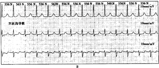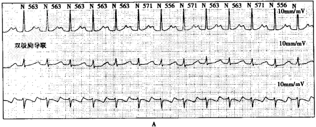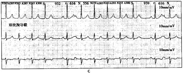 - [材料题] 男性,33岁,心悸1周就诊。动态心电图检查如下图A、B、C所示。