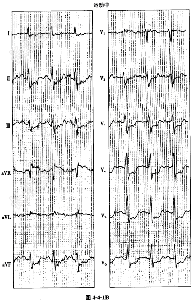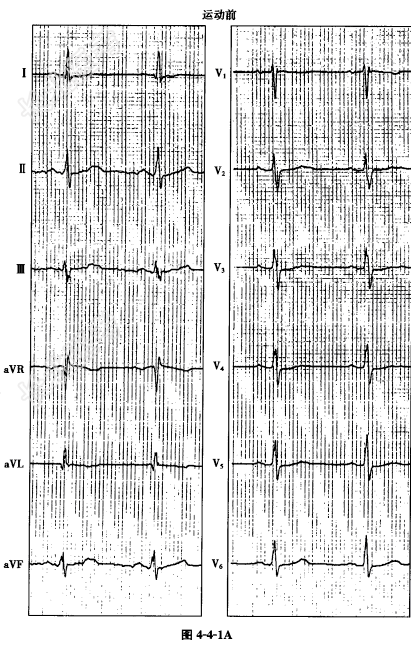 - [材料题] 患者男性,56岁。阵发性胸闷1年,胸片、超声心动图及心电图检查均正常,行运动平板试验检查,运动中随运动量加大,患者诉心前区闷痛。运动前及运动中心电图见图4-4-1A和图4-4-1B。