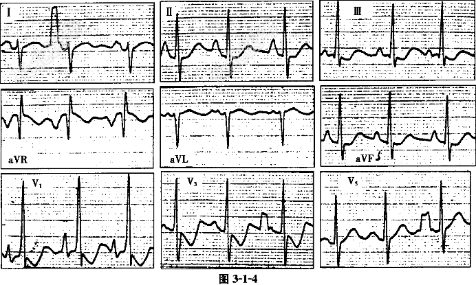 - [材料题] 患者女性,40岁,风湿性心脏病,二尖瓣狭窄合并关闭不全。心电图如图3-1-4所示,