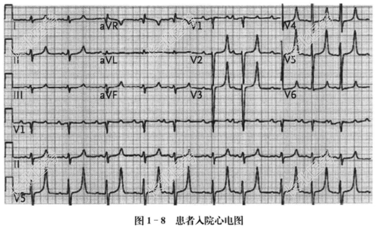 体格检查:患者神志模糊,呼吸困难,颜面肿如球,眼睑似卧蚕,腹部胀满,双下肢严重水肿,四肢末梢冰凉,听诊双下肺明显湿啰音,体温不升,R20次/分,HR46次/分,BP68/45mmHg,经皮动脉血氧饱和度(SpO₂)84%,心律不齐,心电图如下图(图1-8),四肢肌力及肌张力尚正常,左前臂见自体动静脉内瘘成形术后改变。急查肾功能示:血糖(GLU)32.79mmol/L,肌酐761.9μmol/L、尿素氮19.43mmol/L、尿酸553μmol/L,电解质示:钾7.20mmol/L,钙1.25mmol/L,游离钙0.46mmol/L,镁1.11mmol/L,白蛋白3.6g/dL。