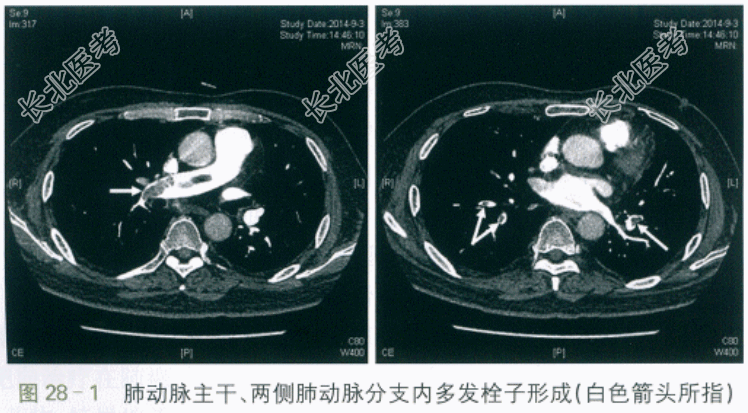 CT肺动脉造影示:肺动脉主干、两侧肺动脉分支内多发栓子形成(见图28-1)。